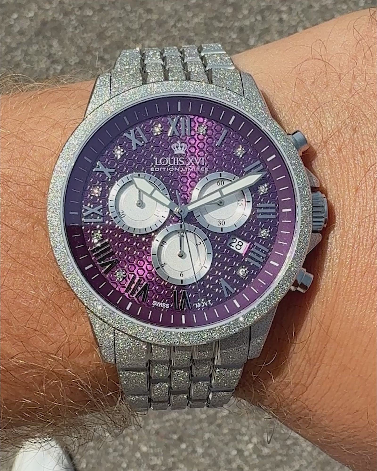 Purple Rush – Weil Violett schon immer die Farbe der Könige war. Das tiefviolette Zifferblatt erinnert an samtige Stoffe, wie man sie aus königlichen Gemächern kennt – luxuriös, geheimnisvoll und ausdrucksstark. In Kombination mit dem frosted Edelstahlgehäuse entsteht ein außergewöhnlicher Kontrast, der modern und königlich zugleich wirkt.