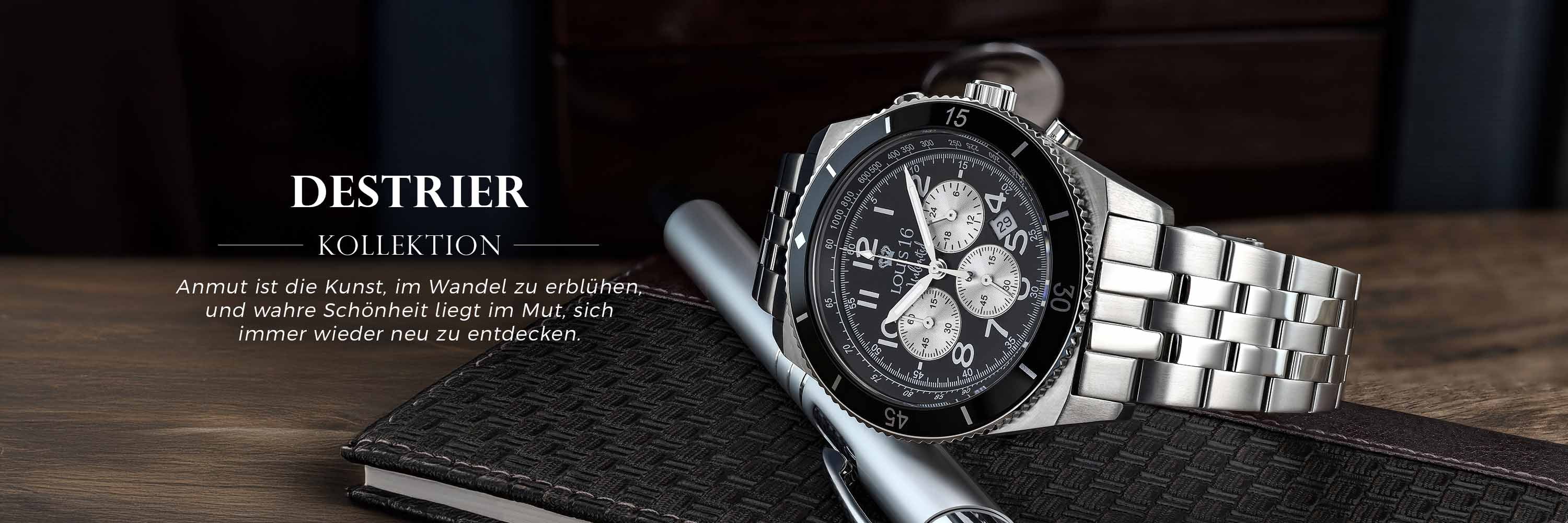 Destrier startet in die Kollektion mit den klassischen, beliebten Farbkombinationen: Gold-Schwarz, Bicolor-Schwarz und dem zeitlosen Silber-Schwarz. Wähle deine Farbe, stoppe deine Zeit und sei von nun an auch im Alltag stilsicher und modisch unterwegs.