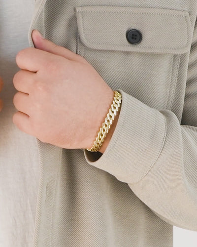 Dieses 10mm breites und aussagekräftige Armband aus S925 Sterlingsilber setzt sich aus goldplattierte Cuban‑Link zusammen mit klaren Linien und kompromisslosen Glanz.
