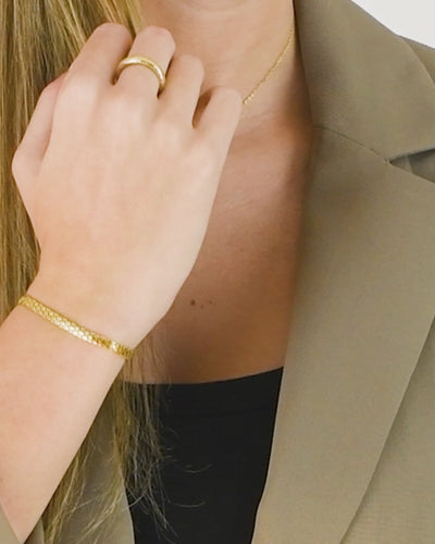 Dieses Armband aus S925 Sterlingsilber zeigt entlang der gesamten Länge ein durchbrochenes Spitzenmuster mit organischen, tropfenartigen Öffnungen. Das filigrane Geflecht lässt das Licht durch die Glieder spielen und erzeugt bei jeder Bewegung einen zarten, lebendigen Schimmer. Weich gerundete Kanten und eine glatt polierte Unterseite sorgen für angenehmen Tragekomfort. Erhältlich in zwei Ausführungen: 14K-Gold-Finish oder Silber.