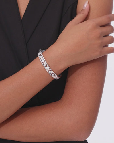 Der FLORALE Armreif in Silber besteht und zeigt eine klare, geschlossene Rundform. Das durchgehende Ornament wird von pavégefassten Zirkonia begleitet, wodurch ein feines Wechselspiel aus Struktur und Licht entsteht.