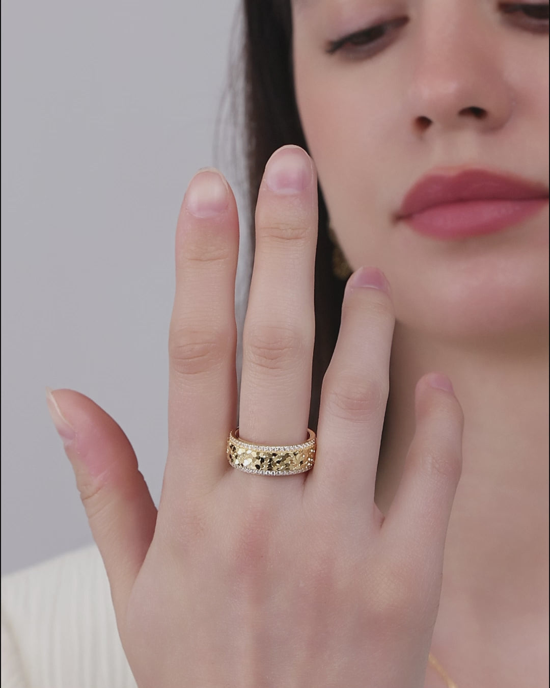 Inspiriert vom Moment, in dem Licht auf der Haut verweilt, entfaltet dieser Ring durch eine fein abgestufte Diamond-Cut-Struktur einen warmen, lebendigen Glanz.