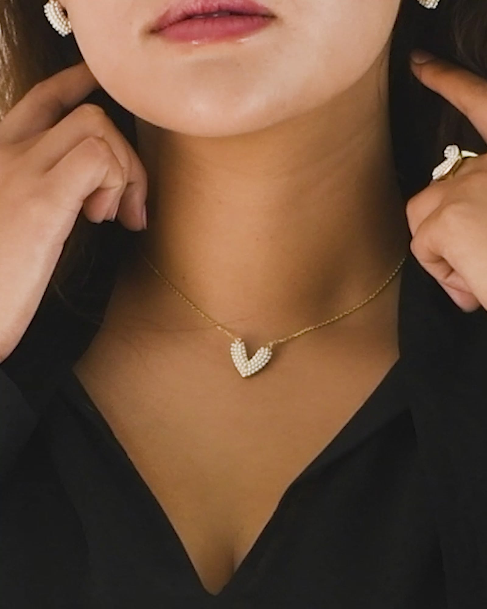 The necklace made of S925 sterling silver with 14K gold plating features a modern-sculptural heart pendant, surrounded by fine, small pearls. The dense arrangement ensures a calm, noble shimmer and the gold-plated setting frames the pearls and emphasizes the modern heart shape.