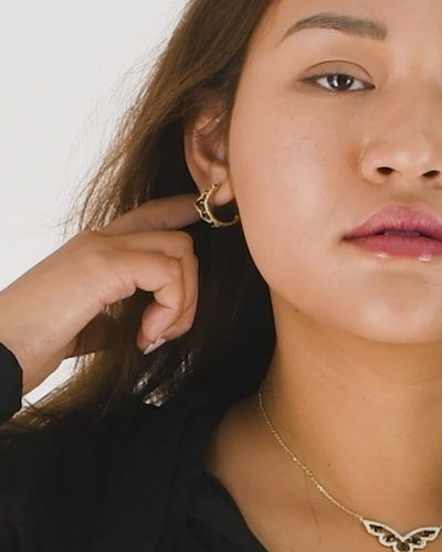 These earrings made of S925 sterling silver with a 14K gold finish showcase a crown-like front motif: A fine pavé border plays around the contour, black marquise stones form radiant tips. The contrast of bright sparkle and deep black appears elegant, modern, and immediately present. The semi-open hoop shape sits lightly, close, and securely. An eye-catcher that collects compliments.
