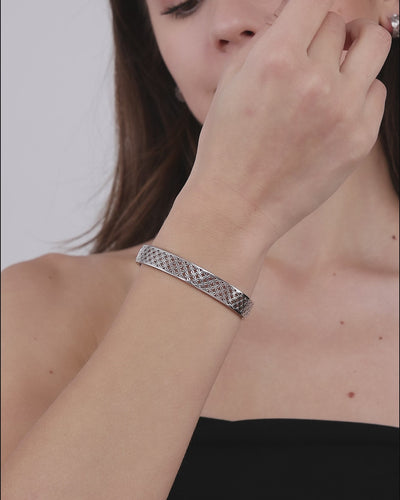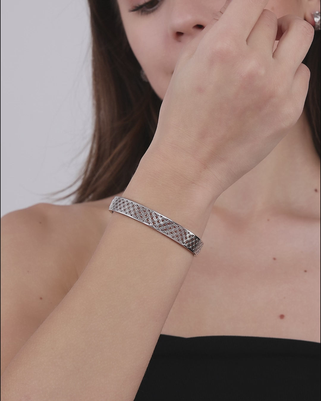 In Silber rückt beim AJOURÉ Armband die Struktur des Durchbruchs in den Mittelpunkt. Die gleichmäßigen Blütenmotive erzeugen einen klaren Rhythmus rund um das Handgelenk. Das Ergebnis ist ein modernes, reduziertes Design mit architektonischer Klarheit.
