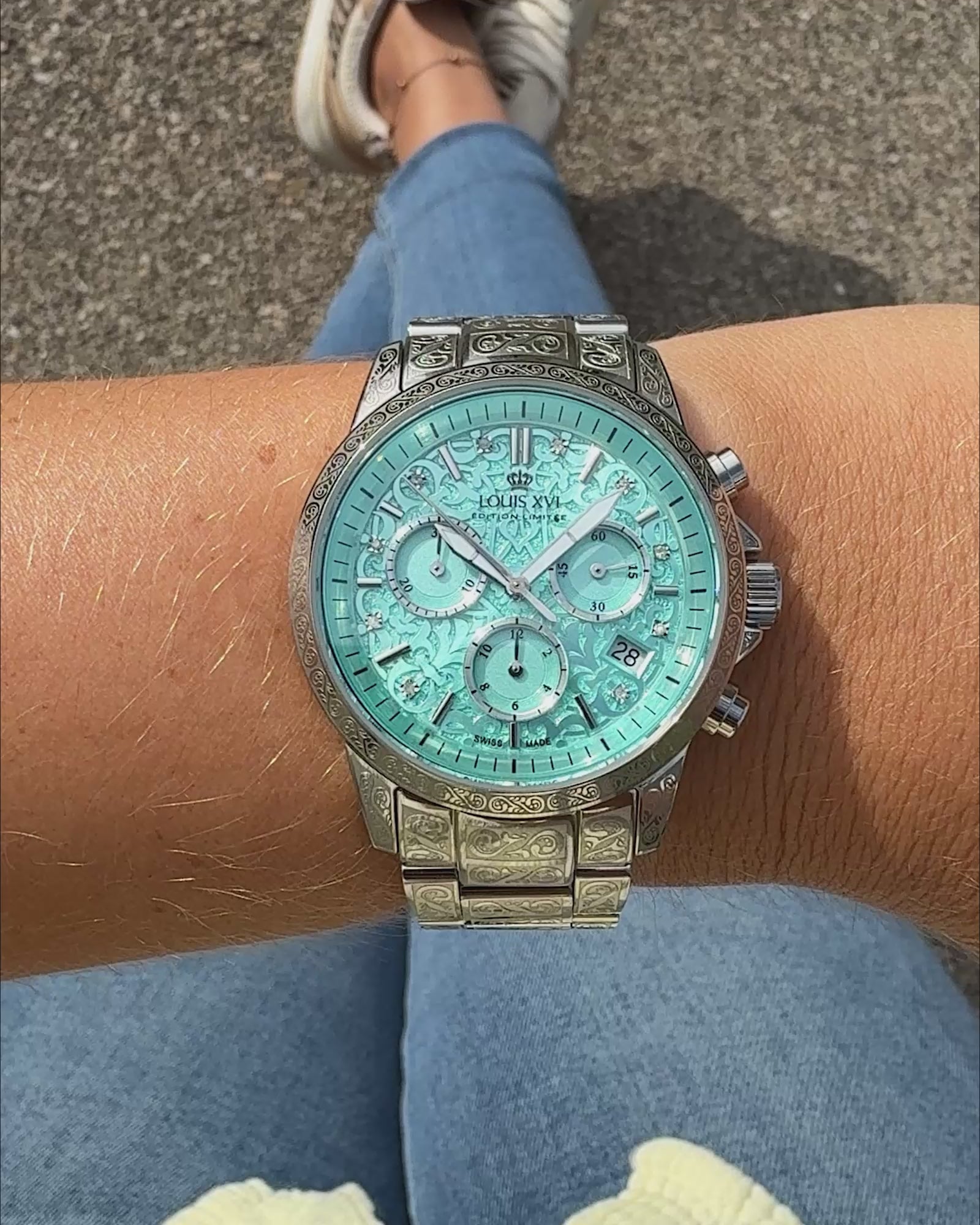 The Palais Royale Femme Ref. 6025 exudes pure freshness. The unique Minty Green dial brings a modern lightness and gives the watch a distinctive character. Combined with the finely engraved silver case and bracelet, it creates a look that is elegant, playful, and confident at the same time.