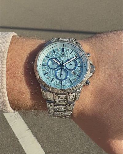 Palais Royal Baby Blue eloxé bleu Ref:1831 emana eleganza e freschezza. Con il suo quadrante unico, parzialmente rifinito a mano, e il suo delicato scintillio, attira tutti gli sguardi su di sé – sia che tu scelga la variante normale o quella anodizzata. Dotato del preciso movimento Ronda 5030.D STARTECH®, questo orologio offre la massima affidabilità e una deviazione annuale massima di soli 6 secondi. Realizzato con materiali robusti come il vetro zaffiro antigraffio e l'acciaio inossidabile 316L, è impermeabile fino a 10 ATM e dispone di una corona avvitata per una sicurezza aggiuntiva. Un accessorio di lusso che unisce bellezza senza tempo e massima qualità – perfetto per i portatori di orologi esigenti.