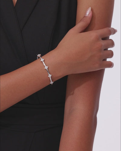 Der FLORALE Armreif in Silber und zeichnet sich durch seinen klaren, kühlen Glanz aus. Mehrere florale Zirkonia-Besätze setzen rhythmische Lichtakzente entlang der glatten Form.
