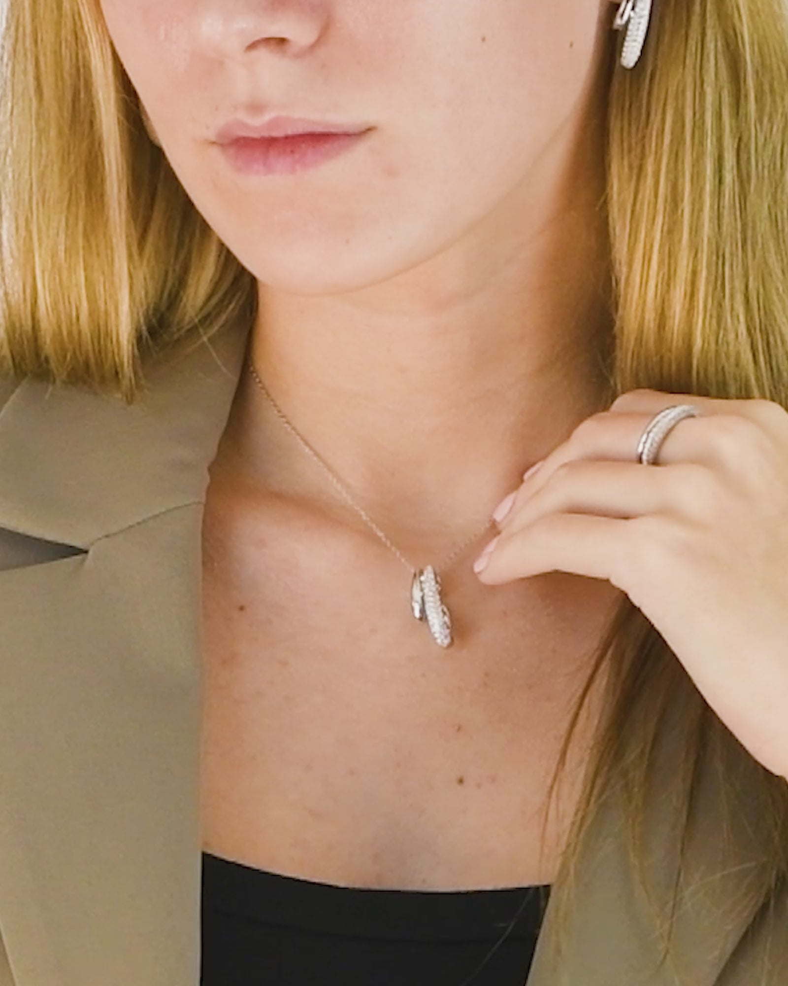 La catena in argento sterling S925 porta un ciondolo alto 25 mm, composto da due gocce allungate: un elemento lucidato per un bagliore tranquillo, una goccia pavé di zirconia per un luccichio raffinato. Insieme creano un look scultoreo e moderno con un'elegante leggerezza.
