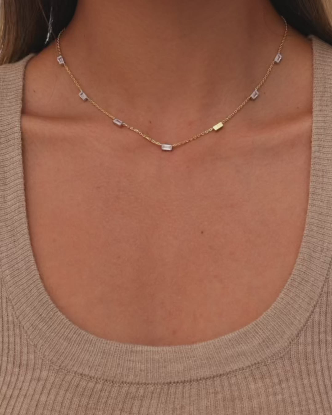 Die Bicolore Baguette Halskette aus 925er Silber trägt fein gesetzte Baguette-Schliffe, deren Platzierung bewusst gewählt ist, sodass Lichtpunkte sanft im Bereich des Schlüsselbeins erscheinen.