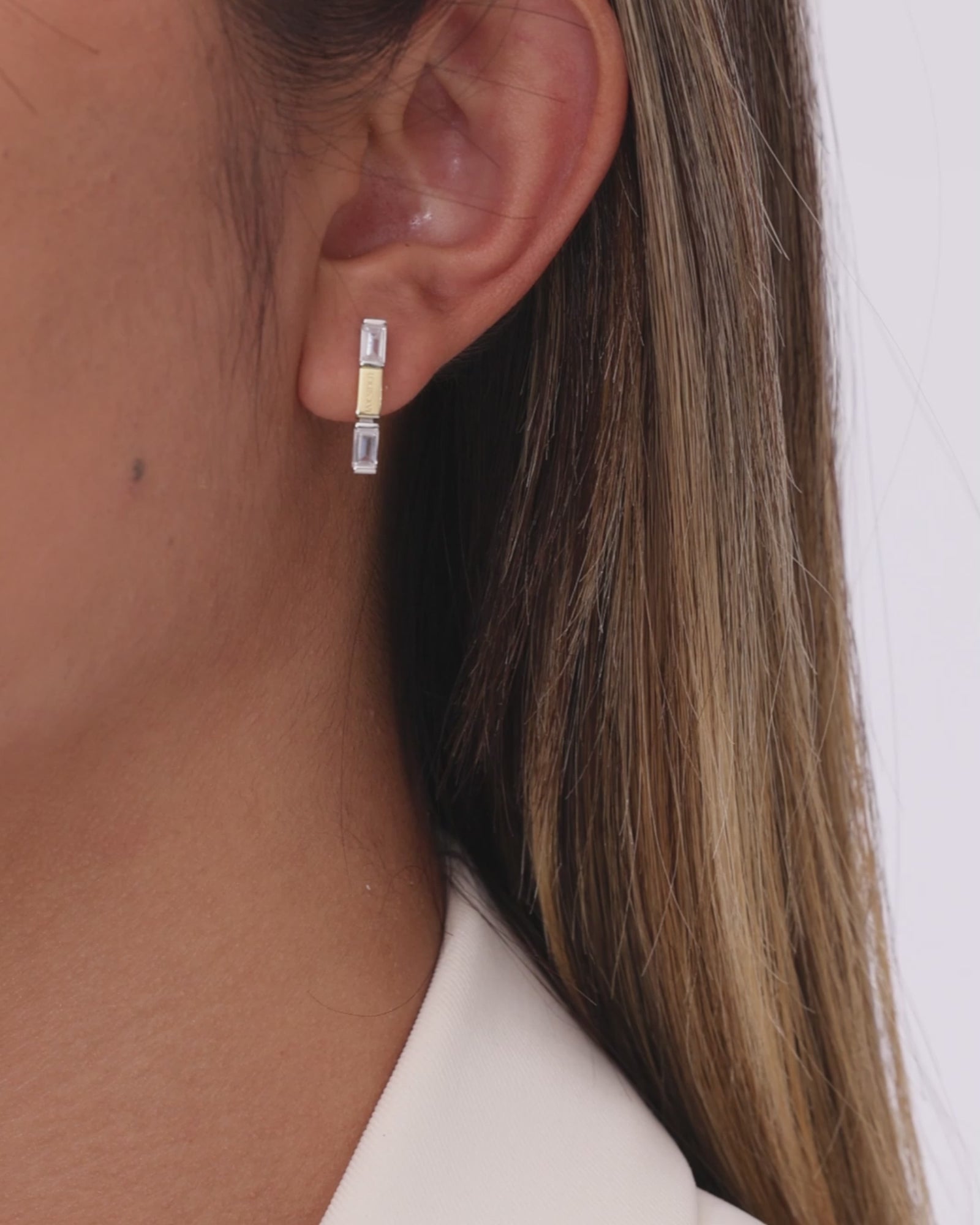 Die Bicolore Baguette Ohrstecker aus 925er Silber zeigen den Baguette-Schliff in vertikaler Ausrichtung, eng an die Kontur des Ohrs angepasst. Das Gravurelement ist mittig integriert und wirkt wie eine in die Form eingelassene Signatur.