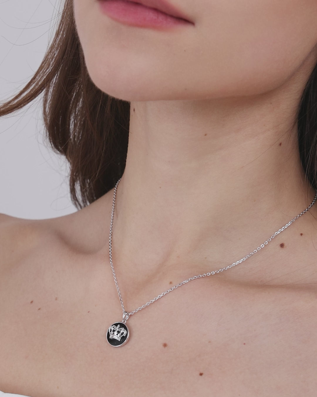 Die silberfarbene Kette ergänzt den runden Anhänger harmonisch, während die schwarze Emaille dem Design Tiefe verleiht.