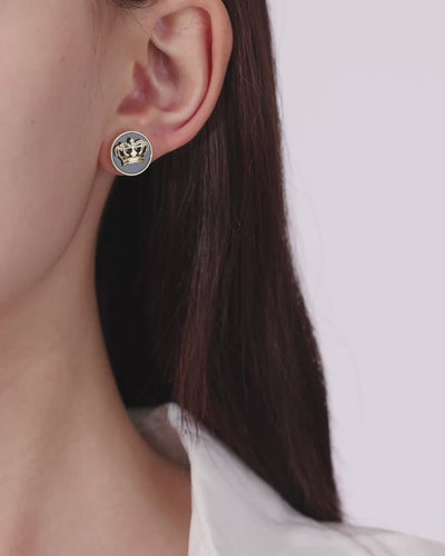 Diese goldfarbenen Ohrstecker verbinden kompakte Eleganz mit feinen Details. Die schwarze Emaille hebt das plastische Kronenmotiv subtil hervor.