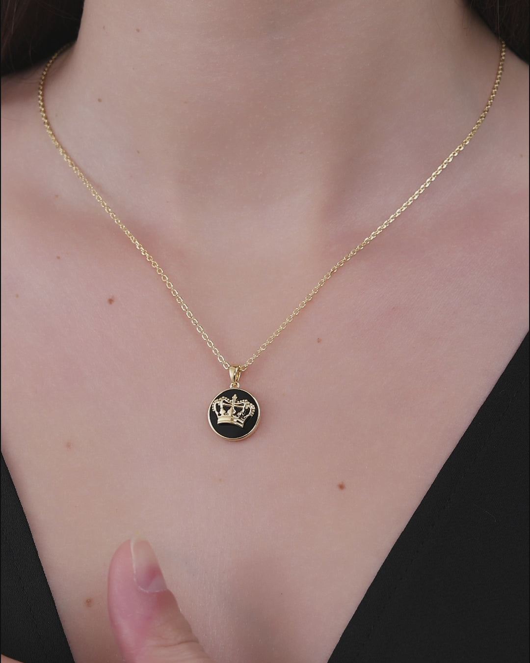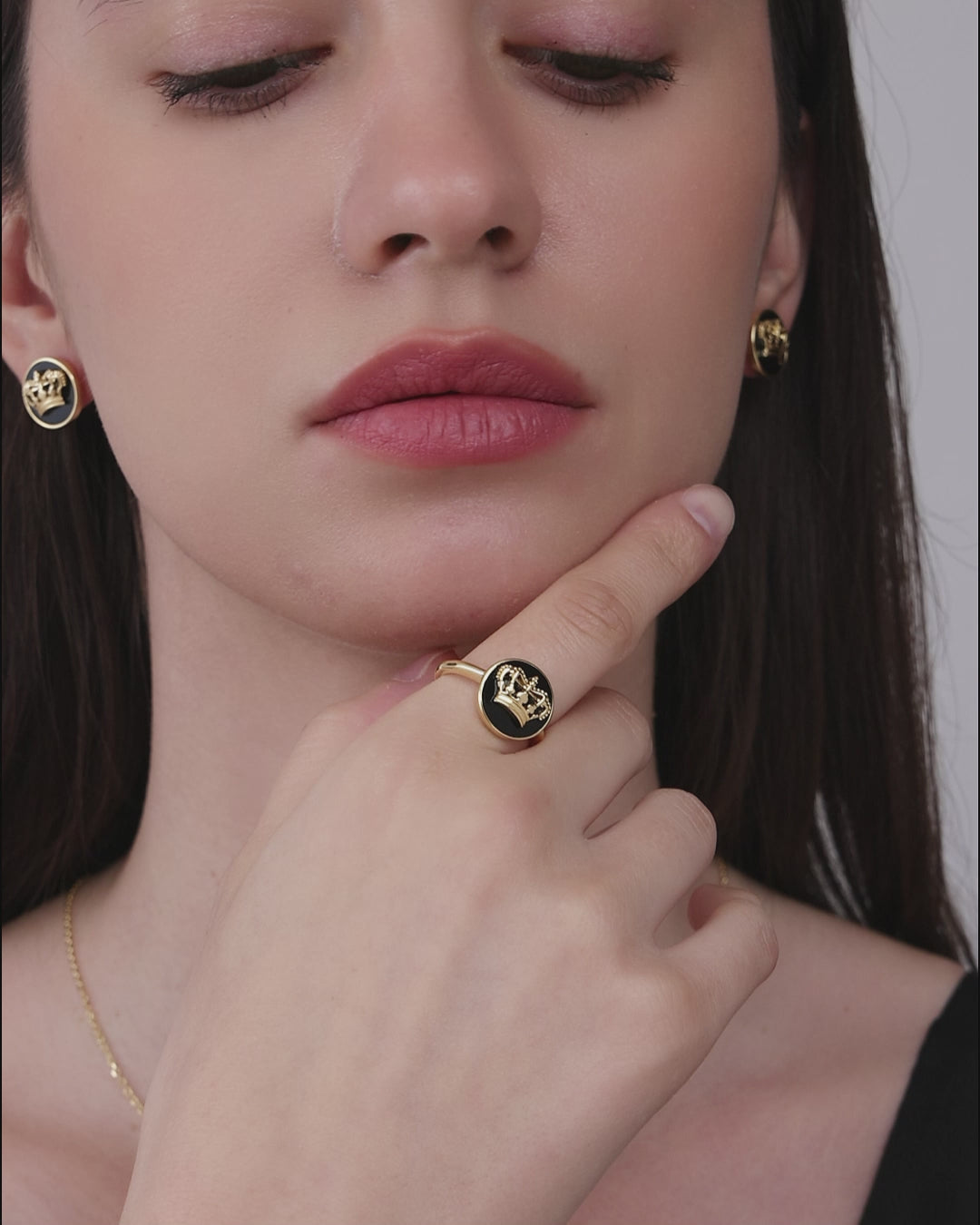 Dieser goldfarbene Ring zeigt eine runde Ringfläche mit tiefschwarzer Emaille, aus der sich das Kronenmotiv ruhig und würdevoll erhebt.