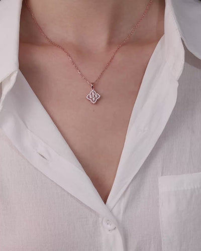 Die Anhängerkette der FLORALE Kollektion stellt ein einzelnes florales Element in den Mittelpunkt. Ein pavébesetzter Zirkonia-Rahmen definiert die Form, während die offene Struktur dem Licht Raum lässt. Der Mittelstein hält die Komposition in ruhiger Balance.