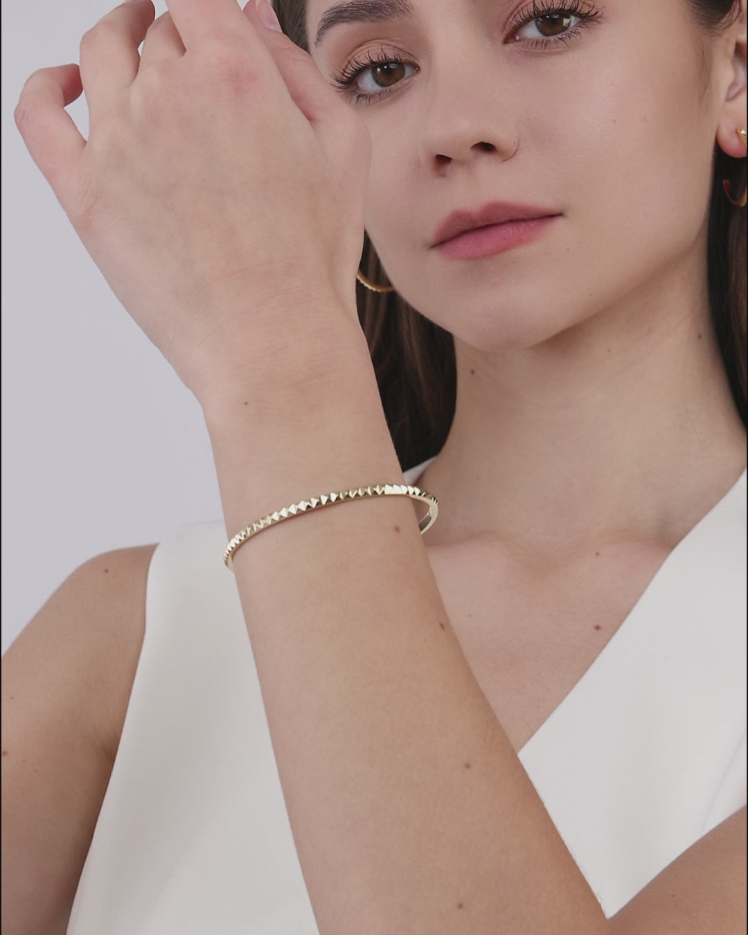 Das Valenza Armband in Gelbgold umschließt das Handgelenk mit präzise gesetzten, nietenartigen Facetten. Das Gold entfaltet in den Lichtkanten eine tiefe, kontrollierte Strahlkraft – präsent, aber niemals aufdringlich.