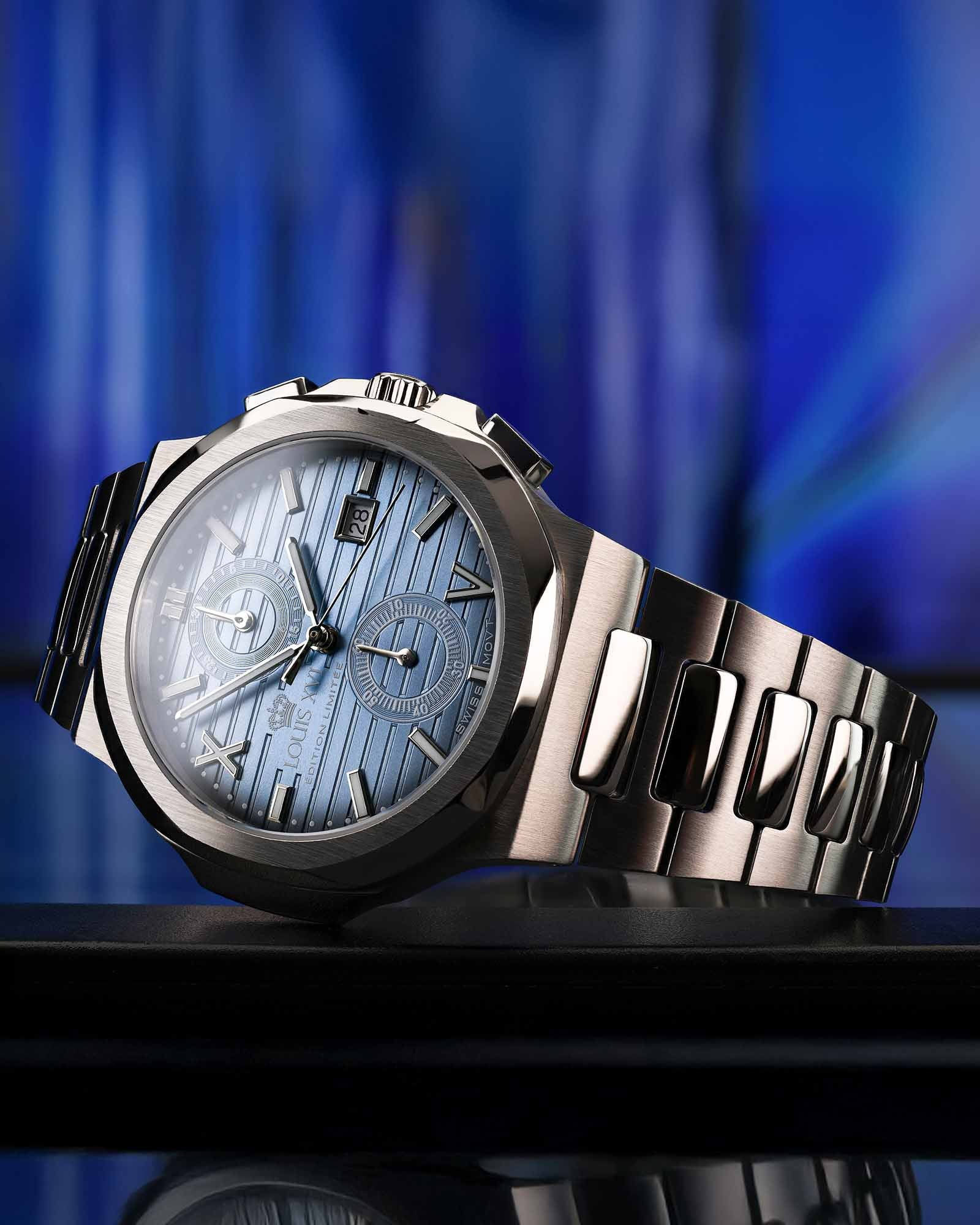 Frais, clair, moderne – le Jeans Blue lumineux de la Ref:1672 apporte de la légèreté au poignet. Combiné avec le boîtier argenté et le motif fin du cadran, il crée un look qui s'intègre facilement à tout style. À l'intérieur, le mouvement chronographe suisse Ronda 3520.D STARTECH® assure une fiabilité maximale. Comme chaque modèle de cette série : limité à 1000 pièces dans le monde et équipé de verre saphir résistant aux rayures.